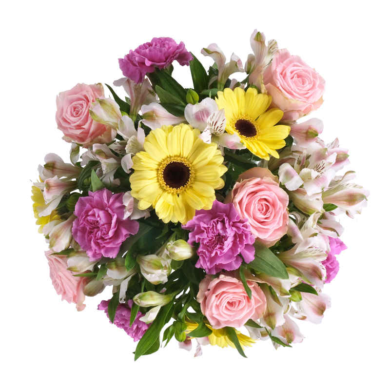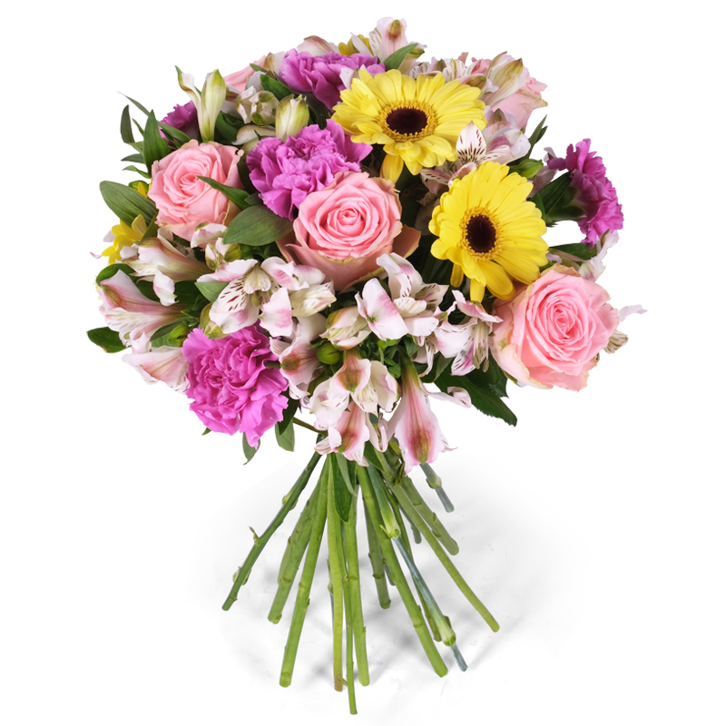 Wybierz bukiet dla bliskiej osoby! Róże wprowadzają romantyzm i ponadczasową elegancję, podczas gdy gerbery dodają radości i słonecznego nastroju do całej kompozycji. Goździki z gęstymi płatkami tworzą pełne kwiaty o miękkiej teksturze, wprowadzając objętość i sprawiając że całość wydaje się bogata. Subtelne alstromerie dopełniają kompozycję finezją, dodając przestrzeni i lekkości.