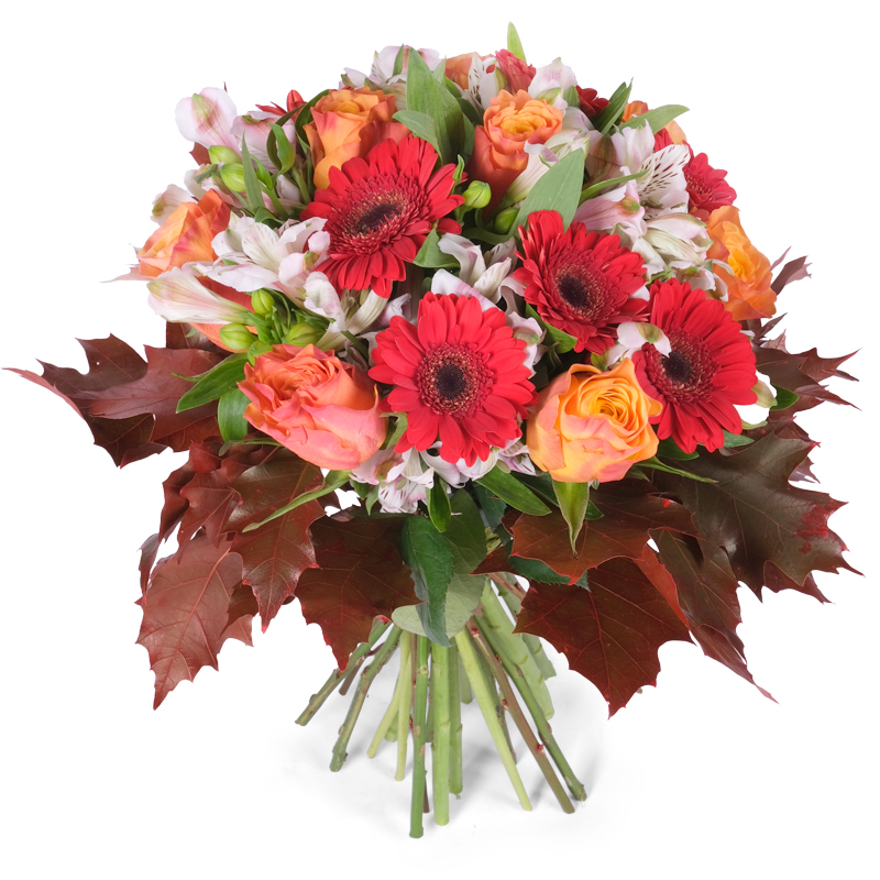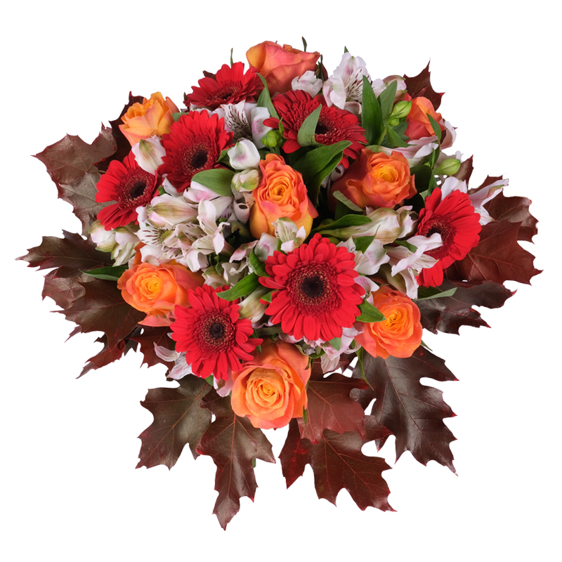 Kolorowa jesień łączy elegancję kwiatów z pięknem jesiennej przyrody. Róże przypominają zachody słońca nad lasem, gerbery wnoszą optymizm, alstromerie dodają finezji. Charakterystyczne jesienne liście są ozdobą kompozycji i ucieszą każdą osobę!