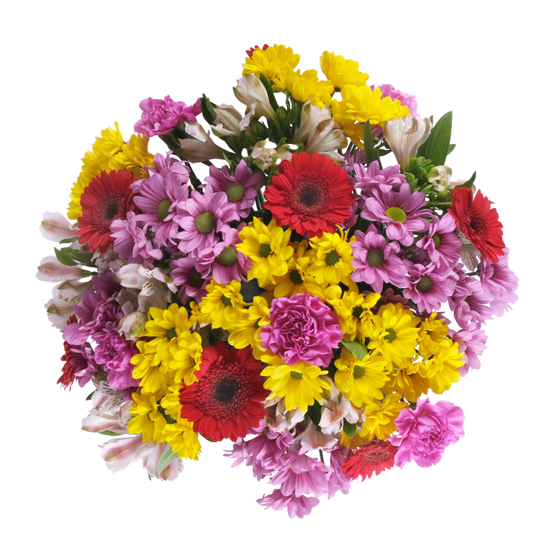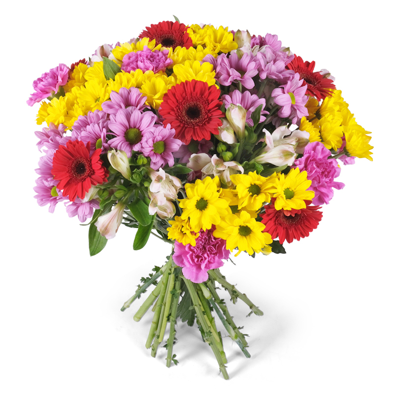 Ten bukiet nie wierzy w półśrodki. Santini, gerbery, goździki oraz alstromerie tworzą bogatą, wielowarstwową kompozycję, która od razu przyciąga uwagę. Różnorodność kwiatów to nie tylko efekt wizualny, ale i ogromny uśmiech u osoby obdarowywanej.